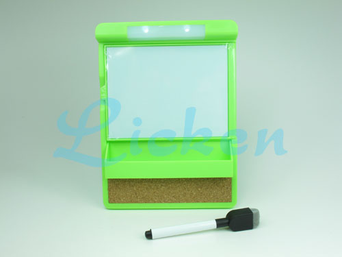 Specification: - White board, photo holder, mirror with light, cork message bard, dry erase marker and 5 push pins- Require 'LED' battery for light mirror