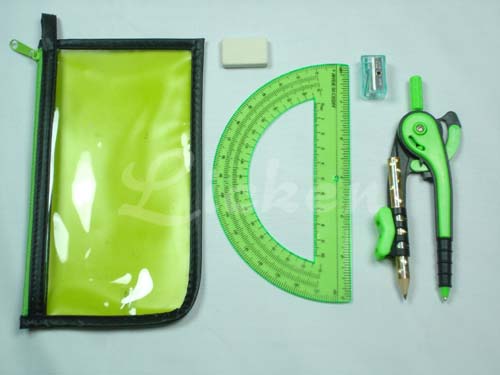 Specification: - 6''/180 degree protractor, plastic ball bearing compass, 3-1/2'' wooden pencil, pencil sharpner, eraser and vinyl zipper bag- Assorted colors