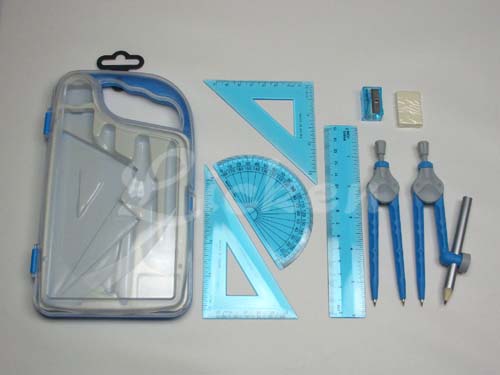 Specification: - 6''/15cm ruler, 45 & 60 degree triangles, 180 degree mini protractor, rigid plastic pencil compass, rigid plastic divider, 3-1/2'' silver- grey pencil, eraser, pencil sharapener and plastic storage box with handle slot- Assorted colors
