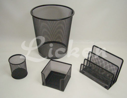 Specification: - Round Trash Can - 11'' x 10-1/4'' diameter- Letter Sorter - 7-1/8'' x 3'' x 5-1/4''- Memo Holder - 4-1/8'' x 4-1/8'' x 3-1/8''- Round Pen Holder - 4'' x 3-3/8'' diameter- Color: black & silver